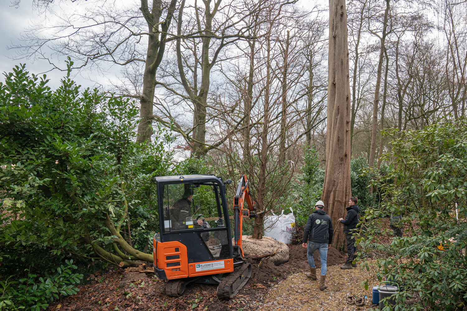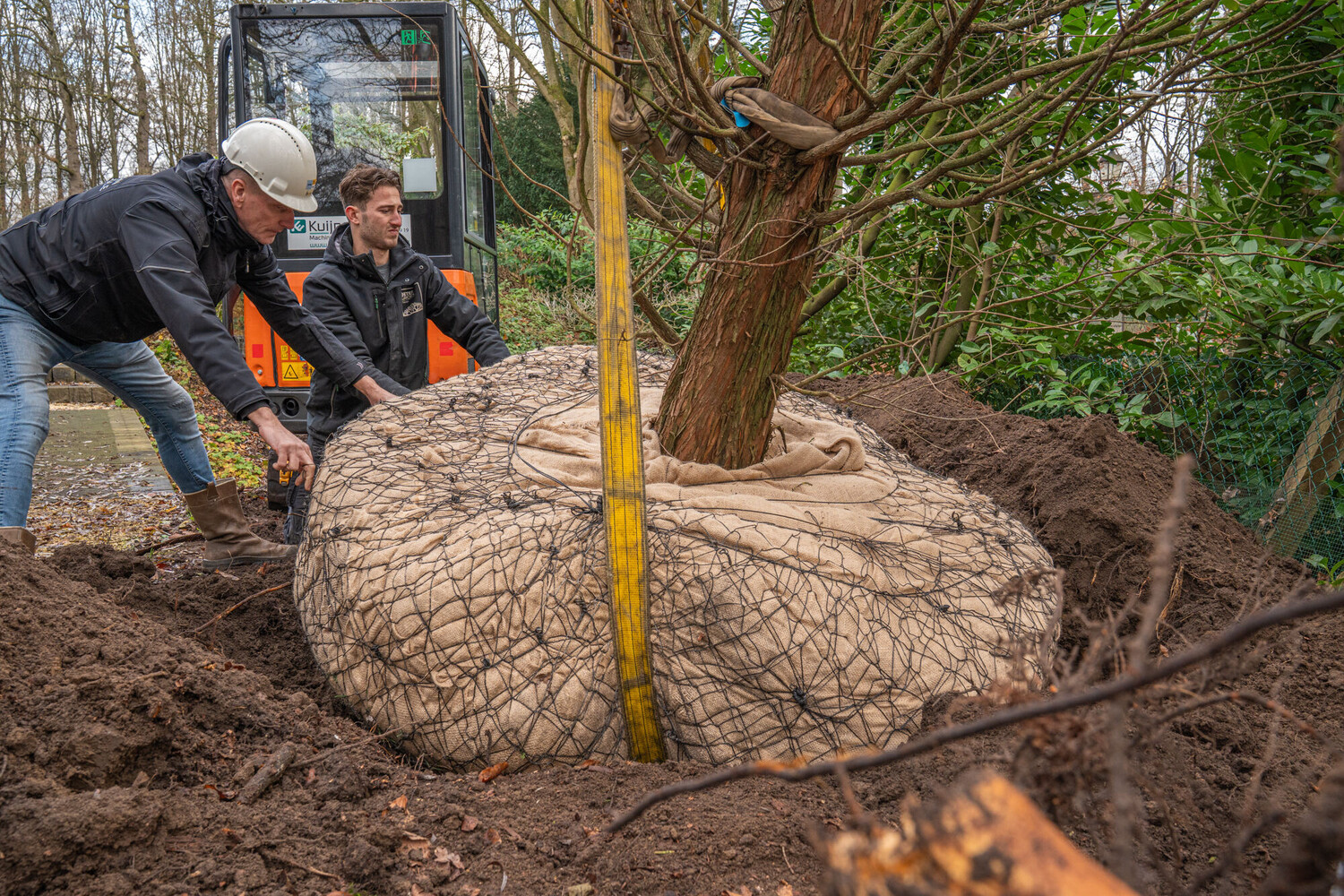 Om de uitvoering efficiënt en gecontroleerd te laten verlopen, is het werk gefaseerd voorbereid. Vooraf is een minikraan op locatie gehesen om het plantgat te kunnen realiseren. Dit plantgat is vervolgens op maat gegraven, volledig afgestemd op de kluitafmeting van de boom. Ter verbetering van de bodemstructuur is een bigbag met bomenzand aangebracht en zorgvuldig ingewerkt. Daarbij is expliciet rekening gehouden met de hoge waterstand, passend bij de standplaatseisen van de Taxodium distichum, niet voor niets is de gewone naam Moerascipres.