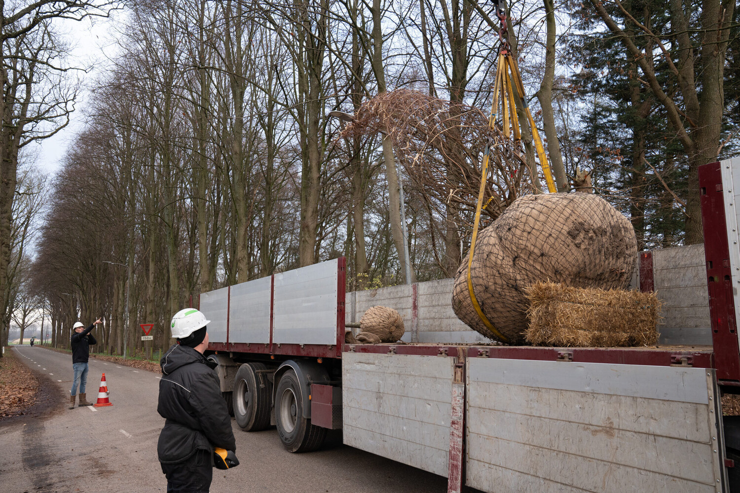 De aanplant vond plaats onder onze volledige begeleiding waardoor de coördinatie tussen transport, kraanmachinist en hovenier goed verliep. De boom werd per oplegger aangevoerd tot aan de maximaal bereikbare positie, waarna deze met een kraan over het hekwerk heen op het eiland is gehesen. Door de beperkte ruimte en het minimale draaibereik van de kraan was bij het positioneren sprake van echt precisiewerk. Vervolgens is de boom zorgvuldig in het plantgat geplaatst, waarbij de juiste plantdiepte en positionering is gewaarborgd. Na plaatsing is de kluit ondergronds verankerd en is de boom ruim ingewaterd, zodat een optimale aansluiting met de omliggende grond kon worden gerealiseerd en nazakken tot een minimum beperkt.